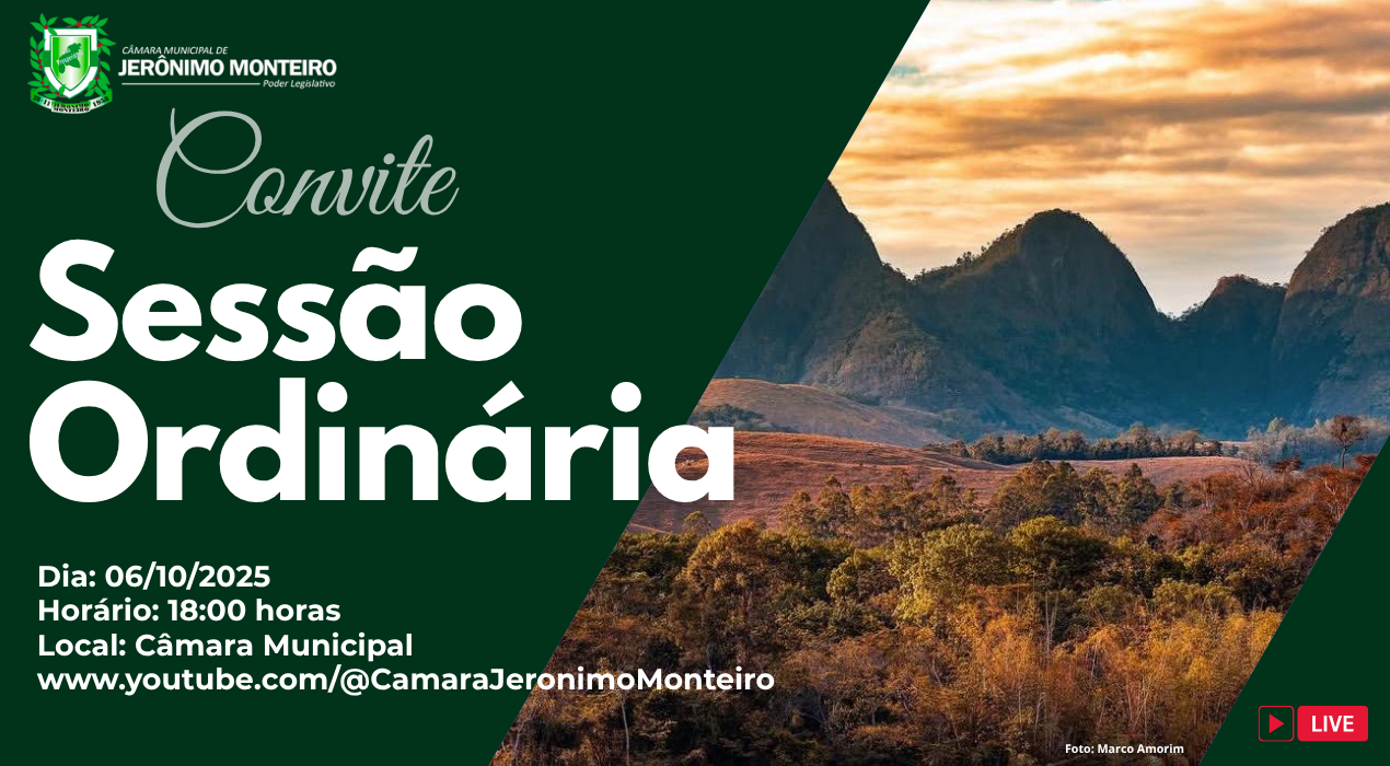 A Câmara Municipal de Jerônimo Monteiro convida toda a população para acompanhar a 17ª Sessão Ordinária, que será realizada na próxima segunda-feira, dia 06 de outubro de 2025, às 18 horas, no plenário da Casa Legislativa.